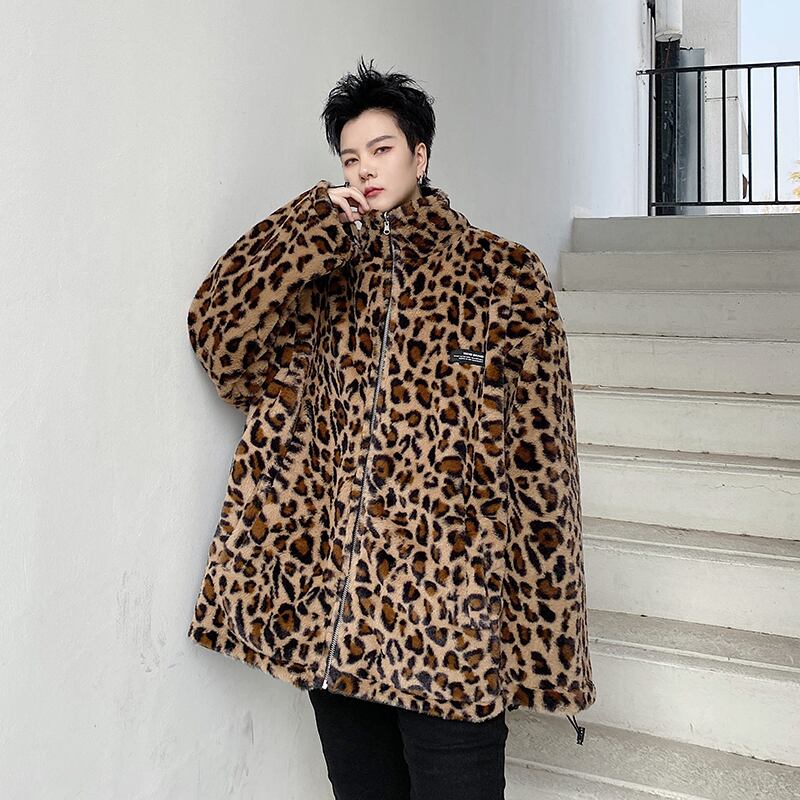 病みカッコイイ メンズファッション ストリートファッション ヒップホップ 個性的 裏原 ウィンターレオパードウールコート ルーズ コットン 冬物 ✝ おしゃれ メンズ 45991570263