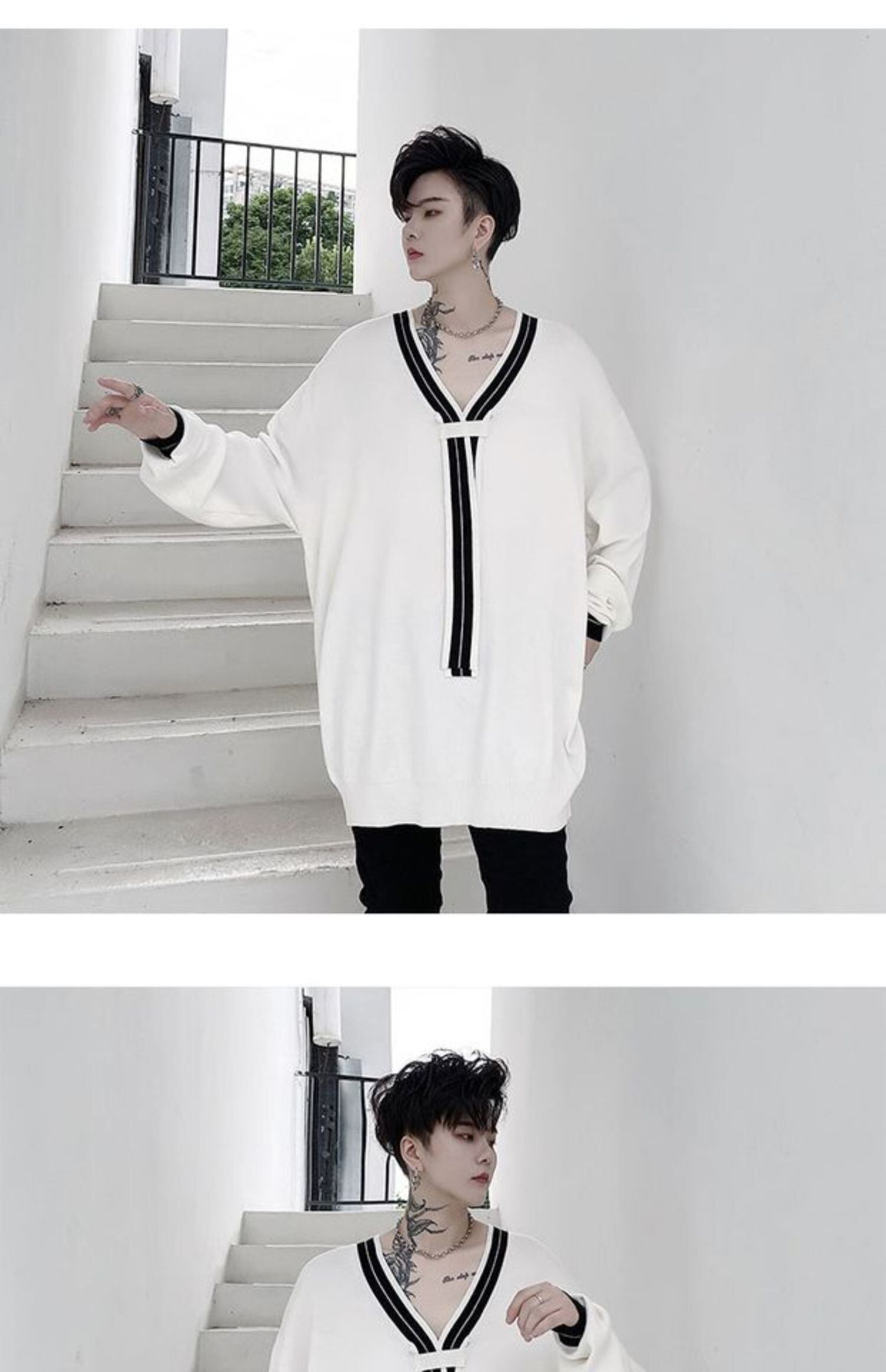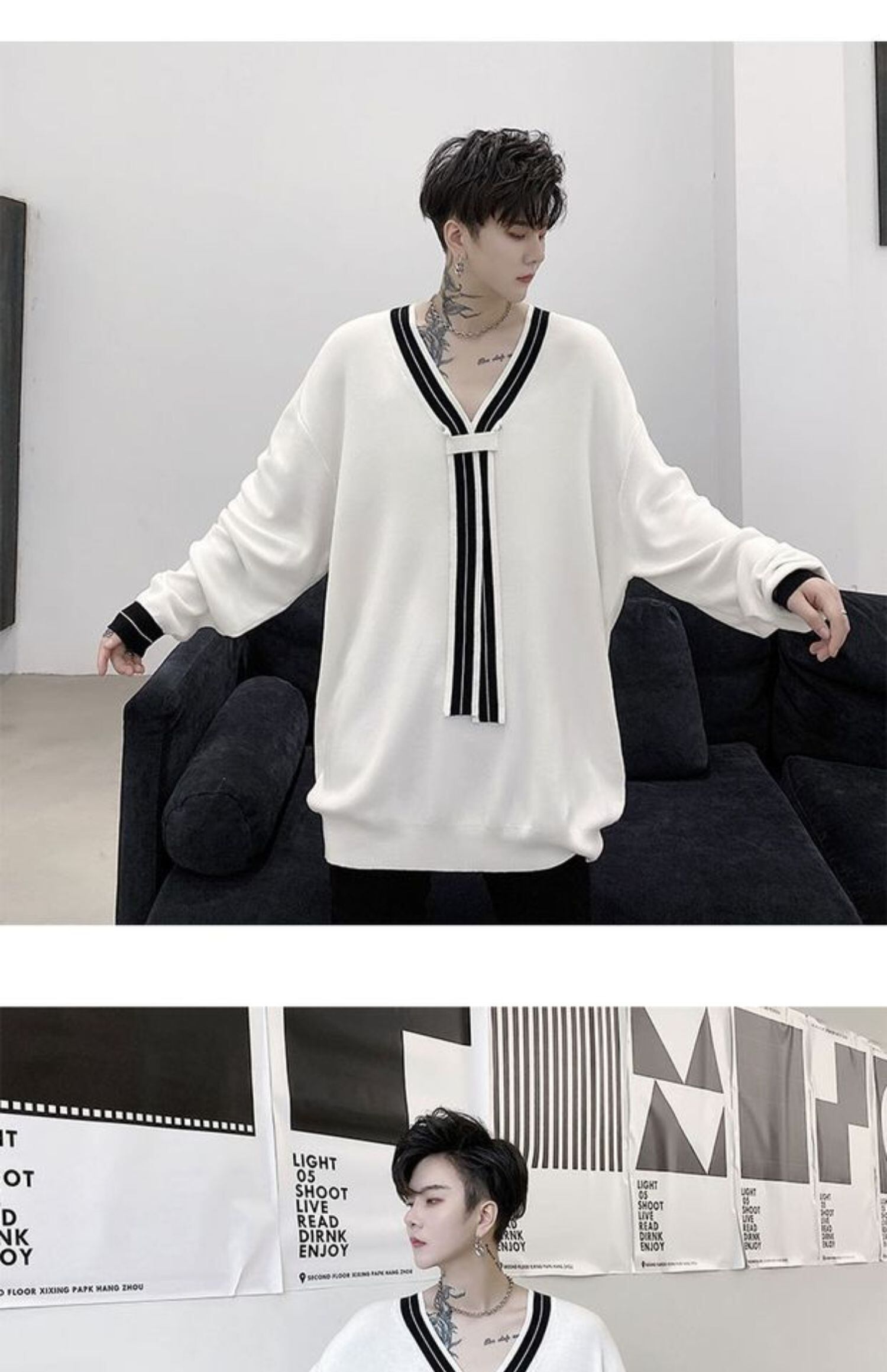 病みカッコイイ メンズファッション ストリートファッション ヒップホップ 個性的 裏原 スプリングオータムスタンダードカラーVネックプルオーバー セーター ルーズトップス レトロ 春物 秋物 ✝ おしゃれ メンズ 45527782542