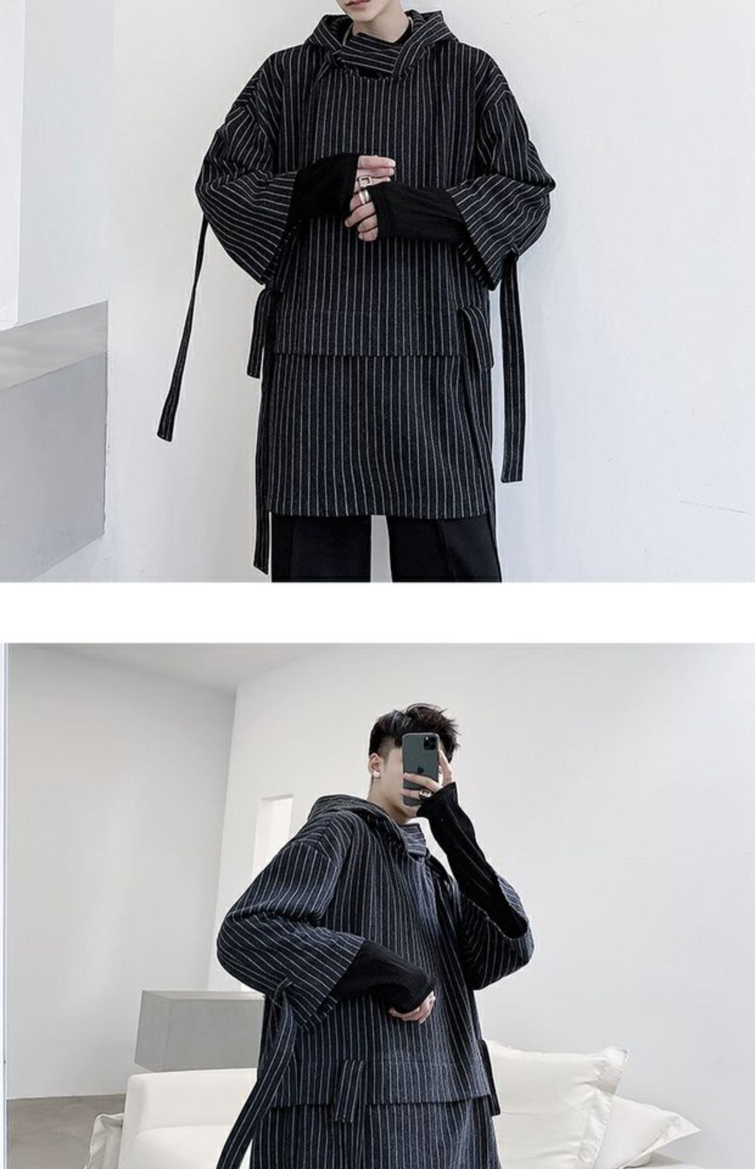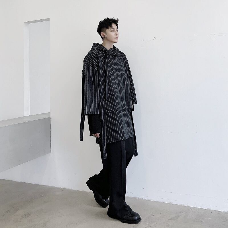 病みカッコイイ メンズファッション ストリートファッション ヒップホップ 個性的 裏原 オータムウィンターストライプフードセーター ルーズスリーブコート プルオーバー トップス 秋物 冬物 ✝ おしゃれ メンズ 30600368131