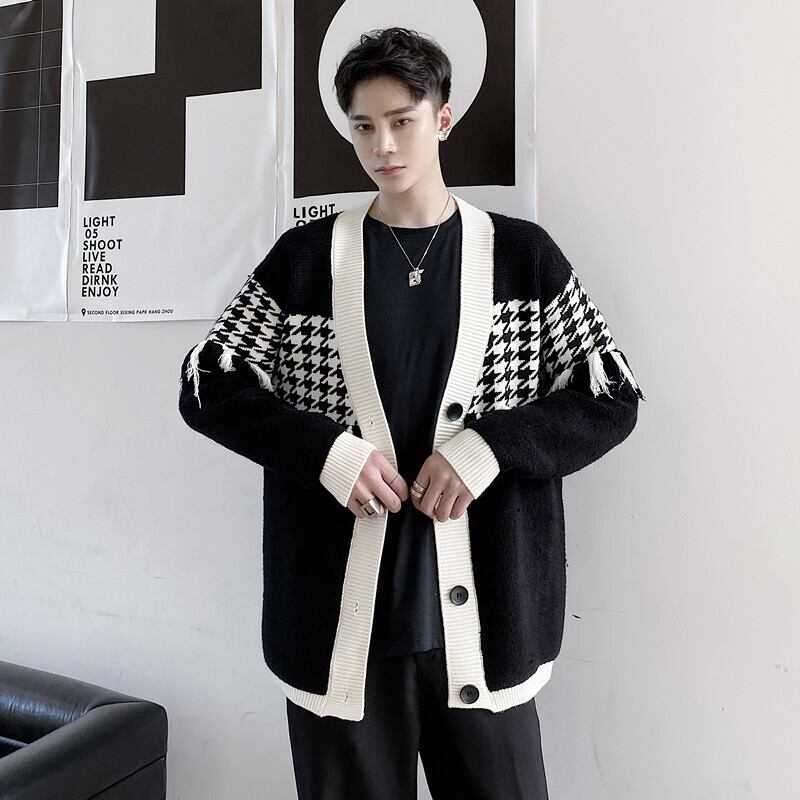 病みカッコイイ メンズファッション ストリートファッション ヒップホップ 個性的 裏原 オータムウィンタースタンダード格子柄カーディガンセーター ルーズスタイルレッドコート レトロ 秋物 冬物 ステッチ ✝ おしゃれ メンズ 44892390718