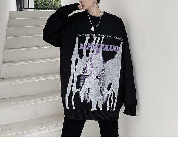 病みカッコイイ メンズファッション ストリートファッション ヒップホップ 個性的 裏原 オータムウィンターダークブラックプリントセーター ルーズプルオーバー トップス 秋物 冬物 ✝ おしゃれ メンズ 16234434271