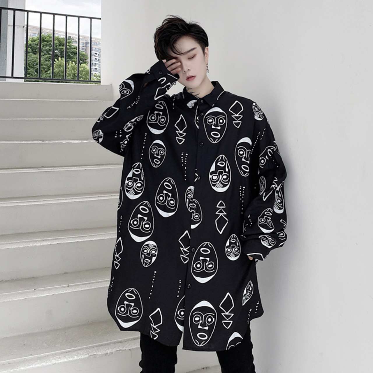 病みカッコイイ メンズファッション ストリートファッション ヒップホップ 個性的 裏原 オータムプリント柄シャツ ルーズカジュアル ロング 秋物 ✝ おしゃれ メンズ 94780330863