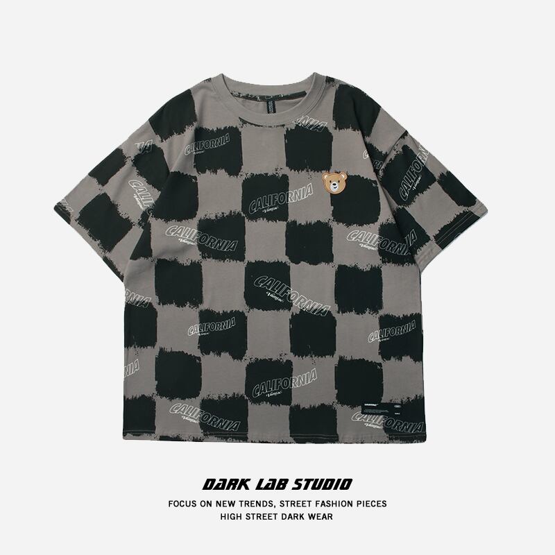 病みカッコイイ メンズファッション ストリートファッション ヒップホップ 個性的 裏原 スタンダードカラー格子柄刺繍Tシャツ ルーズカジュアル レトロ ストリート ✝ メンズファッション97787909207