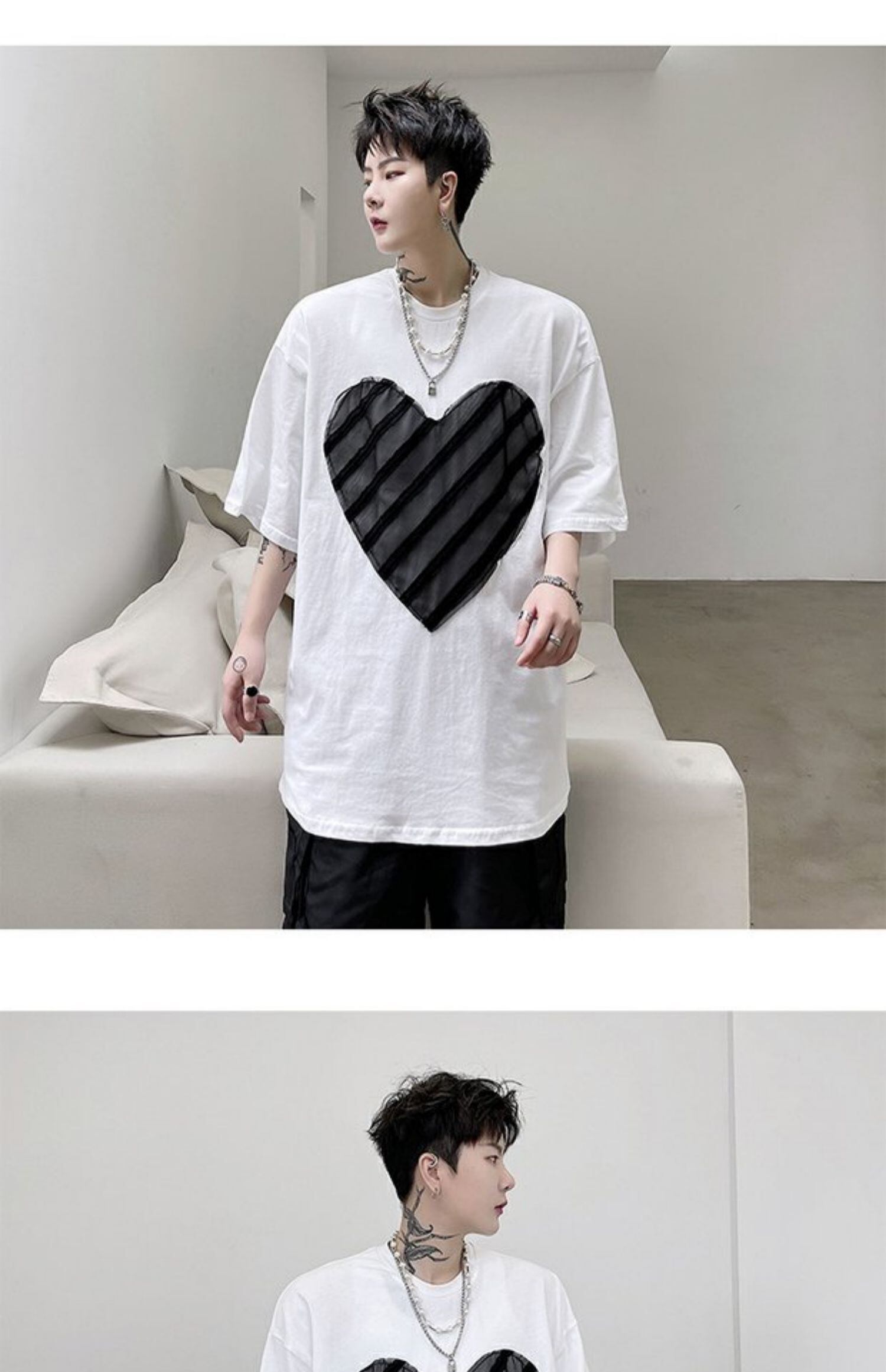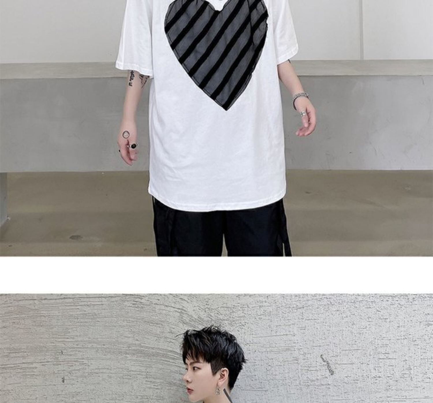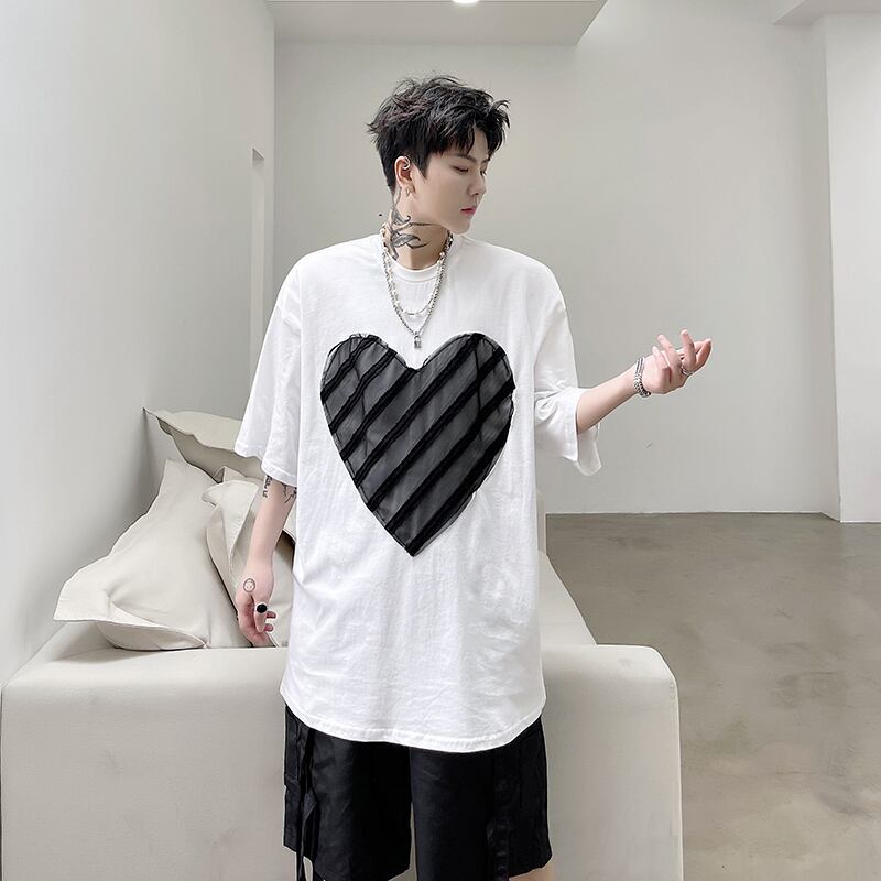 病みカッコイイ メンズファッション ストリートファッション ヒップホップ 個性的 裏原 サマーハートプリントレッドTシャツ ルーズトップス 夏物 ✝ おしゃれ メンズ 1530983775