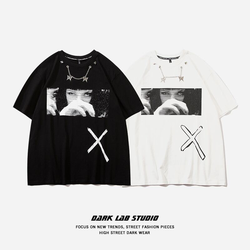 病みカッコイイ メンズファッション ストリートファッション ヒップホップ 個性的 裏原 ダークブラックプリントTシャツ ルーズネックレス カジュアル コットン レース ストリート ✝ メンズファッション7590141327