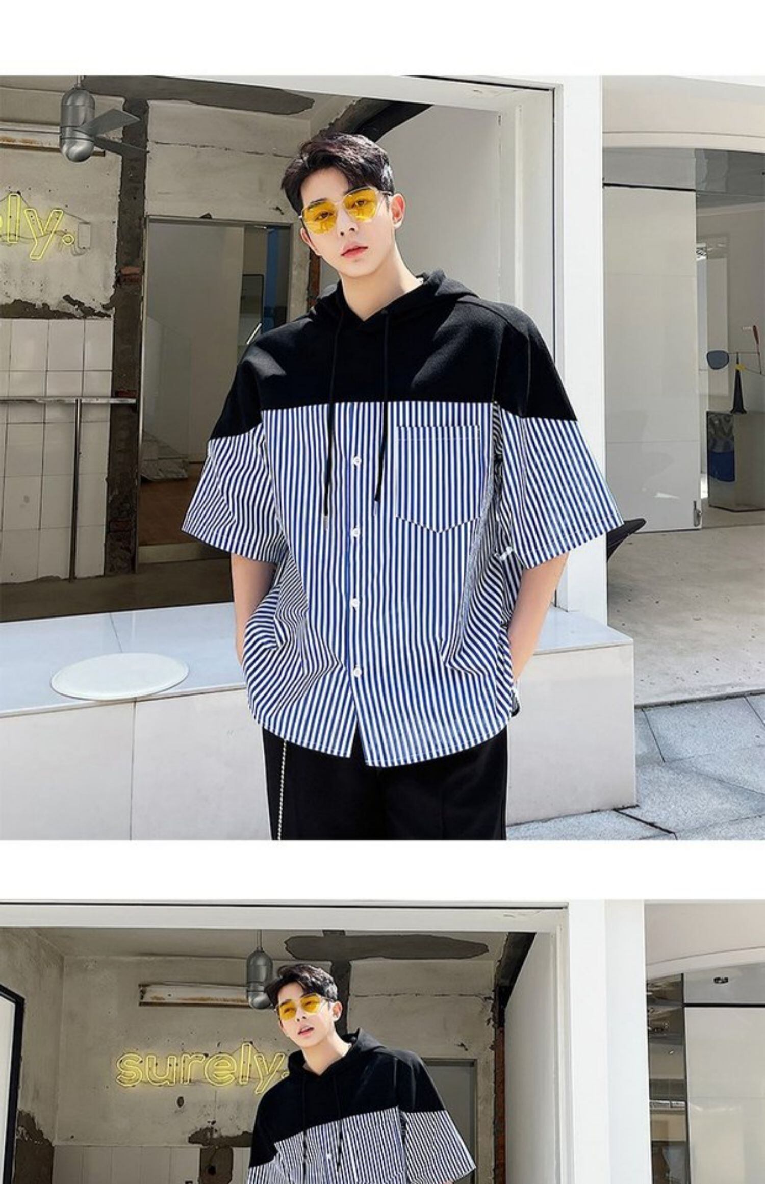 病みカッコイイ メンズファッション ストリートファッション ヒップホップ 個性的 裏原 サマーストライプフードシャツ ルーズ 夏物 ✝ おしゃれ メンズ 38219473901
