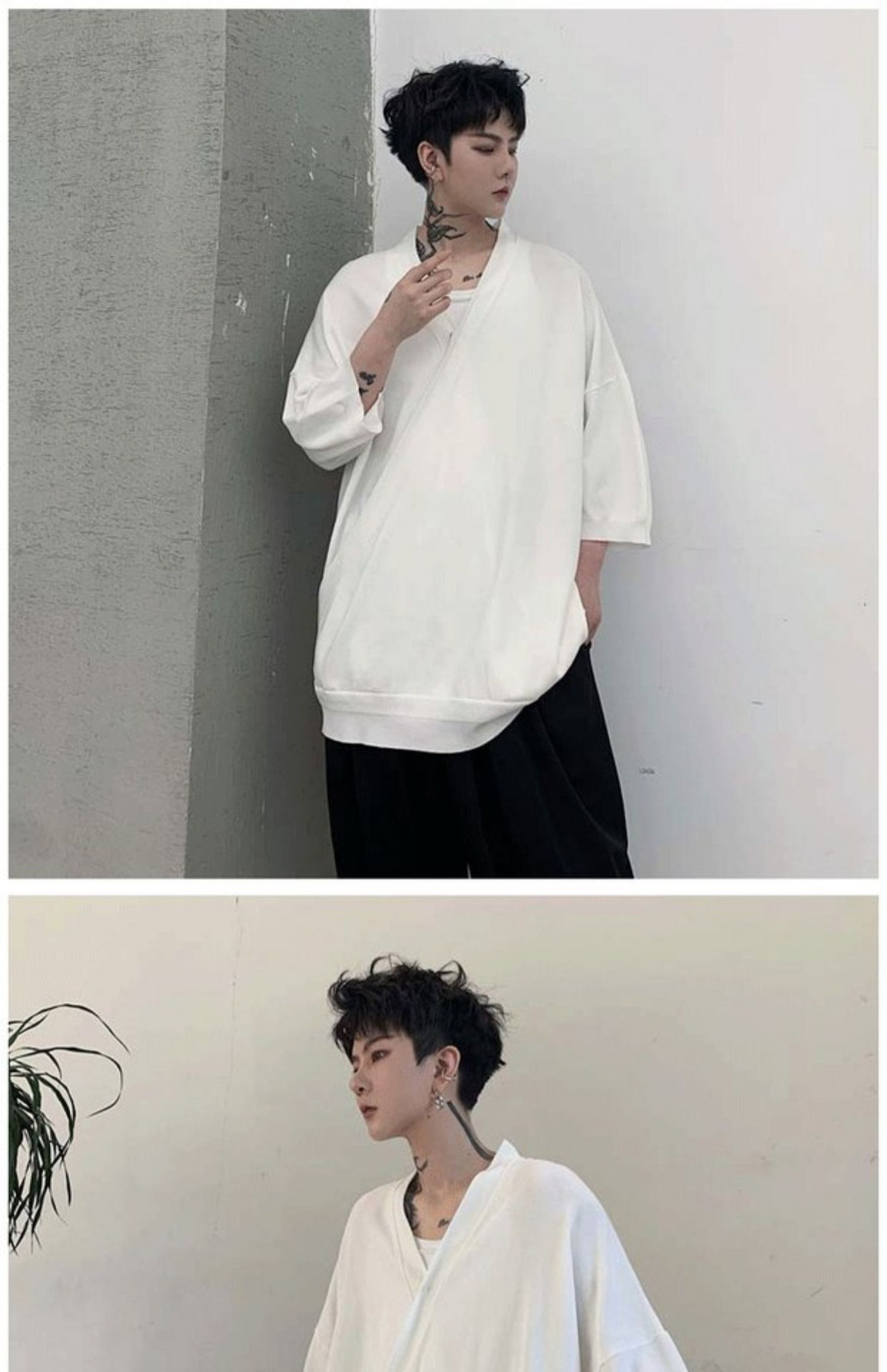 病みカッコイイ メンズファッション ストリートファッション ヒップホップ 個性的 裏原 サマーダークセーター ルーズスタイル薄手VネックTシャツ ジャケット 夏物 ✝ おしゃれ メンズ 75517430946