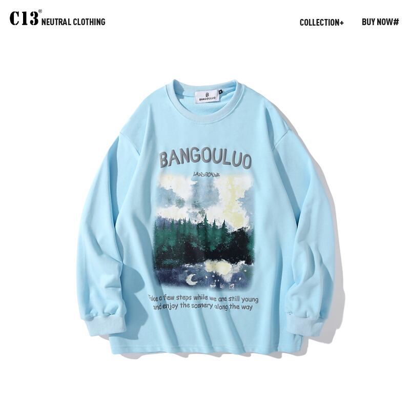 病みカッコイイ メンズファッション ストリートファッション ヒップホップ 個性的 裏原 ブルーラウンドネックセーター レディースオータムプリントルーズカジュアルスタンダードジャケット レトロ ストリート 秋物 Oネック ✝ メンズファッション93863892120