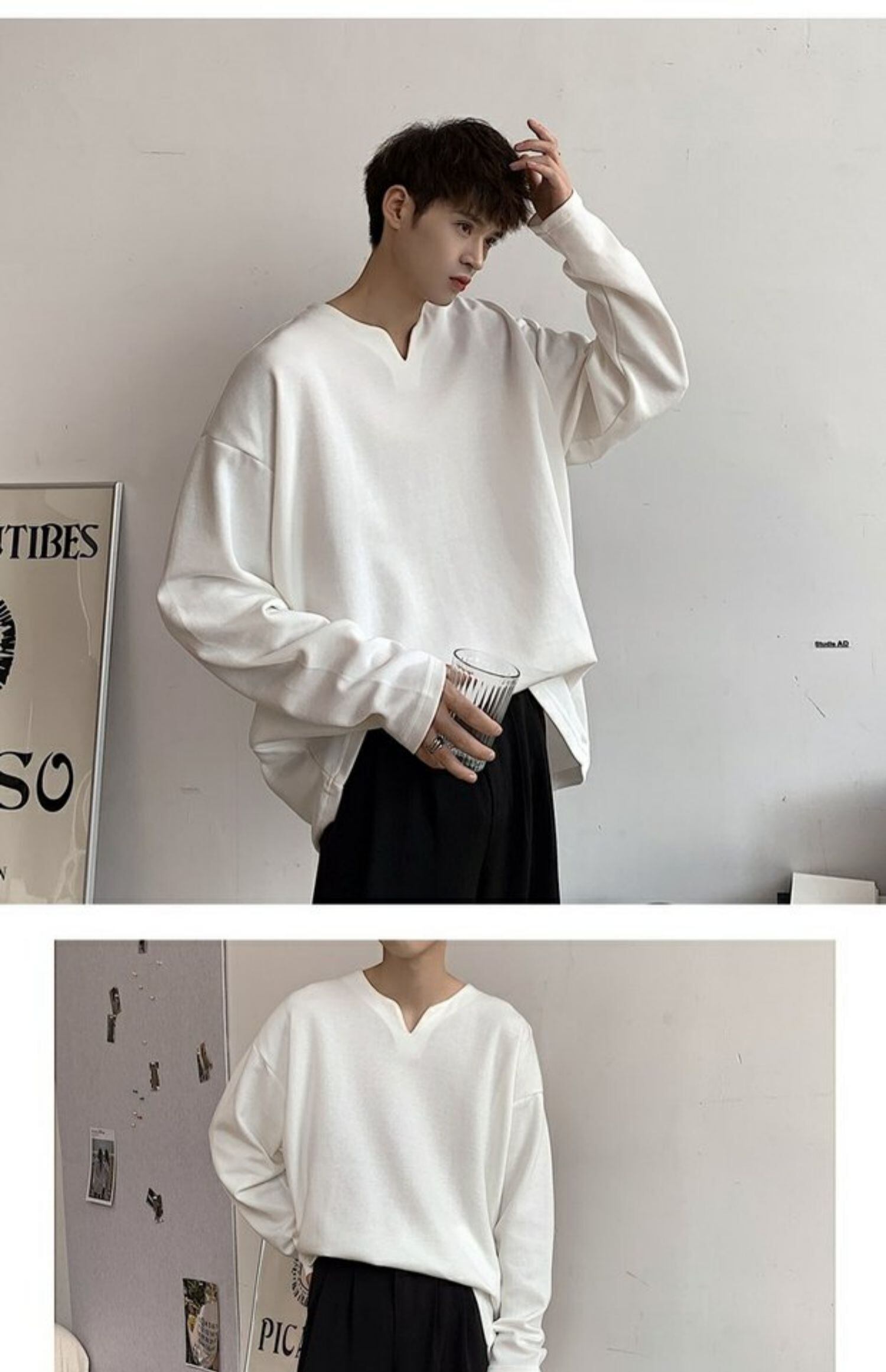 病みカッコイイ メンズファッション ストリートファッション ヒップホップ 個性的 裏原 オータムVネックソリッド カラーTシャツ シャツ ルーズスタイルプルオーバー トップス ロング 秋物 ソリッドカラー ✝ おしゃれ メンズ 72399066159