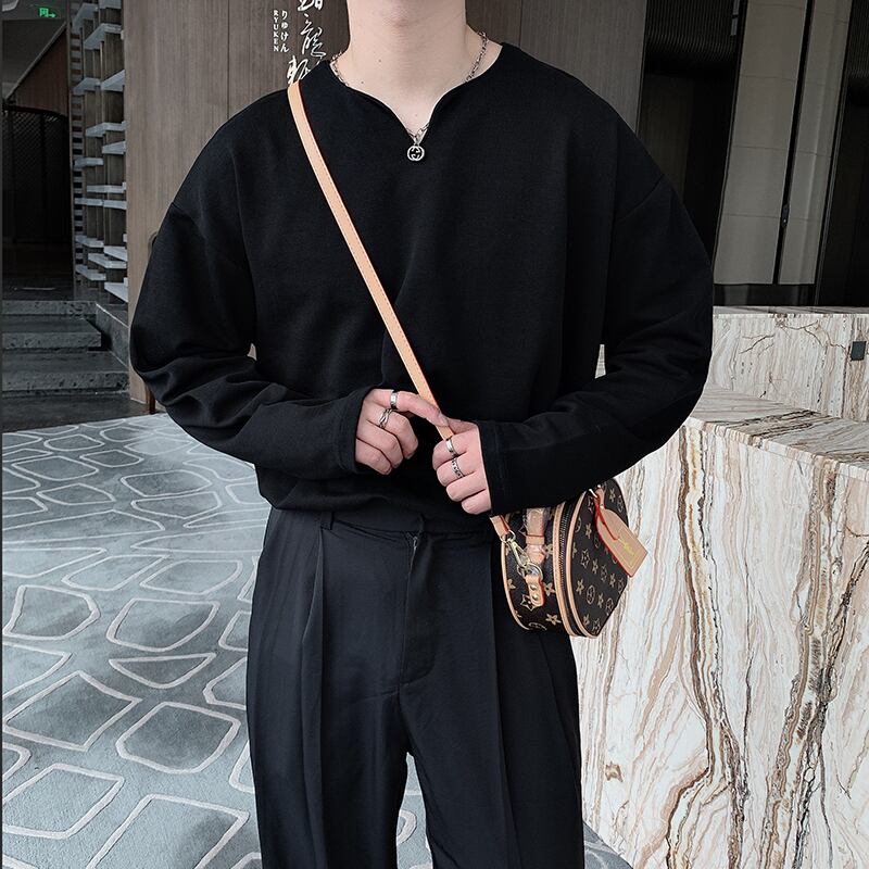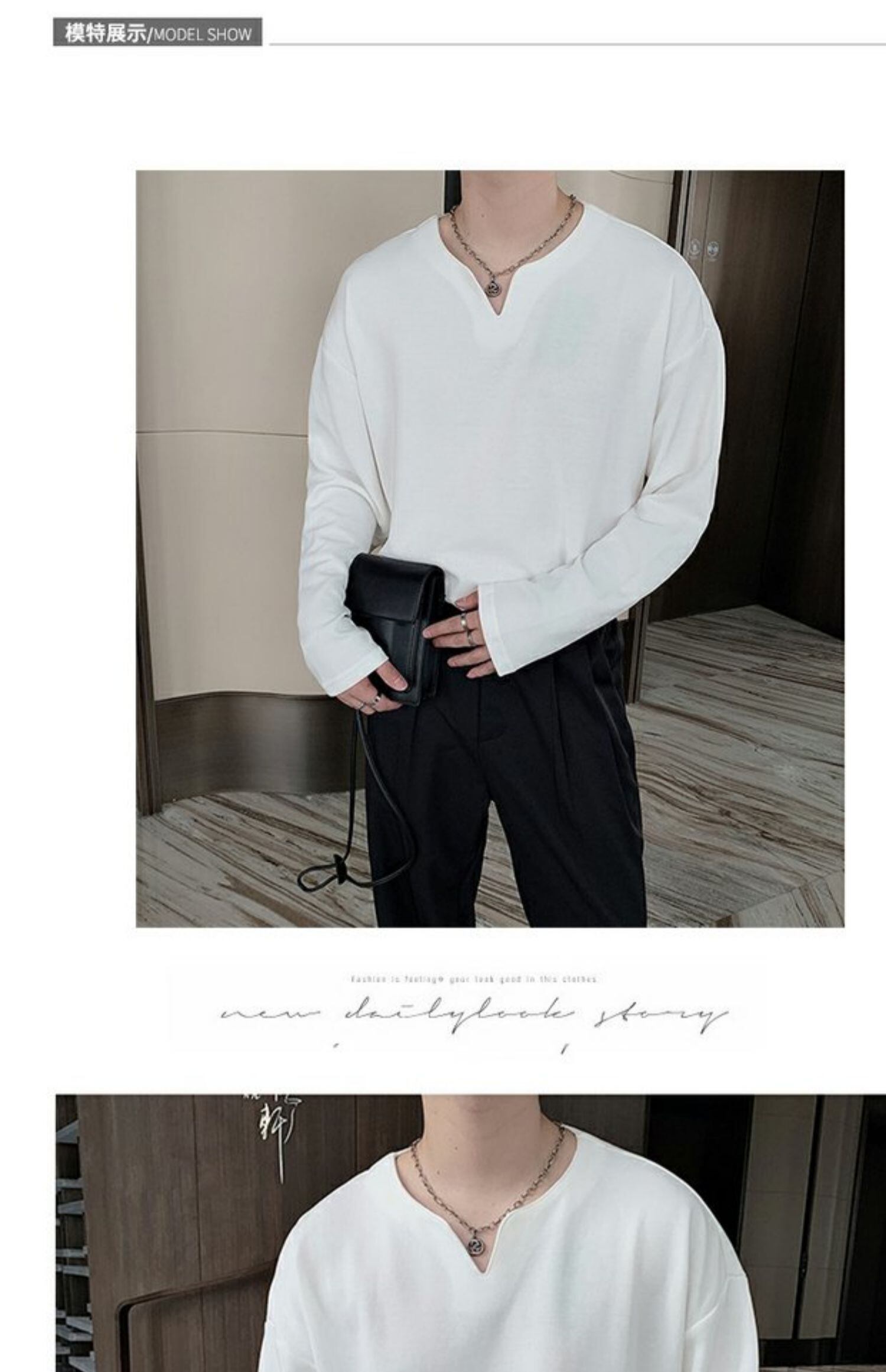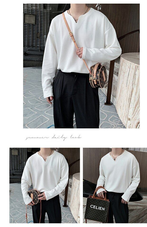 病みカッコイイ メンズファッション ストリートファッション ヒップホップ 個性的 裏原 オータムミニマリストスタイルソリッド カラーVネックTシャツ シャツ ルーズ ロング 秋物 ソリッドカラー ✝ おしゃれ メンズ 29952607505
