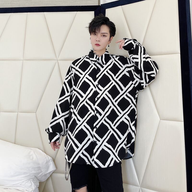 病みカッコイイ メンズファッション ストリートファッション ヒップホップ 個性的 裏原 オータム格子柄プリントシャツ ルーズトップス レッドストライプ ロング 秋物 ✝ おしゃれ メンズ 26838701598