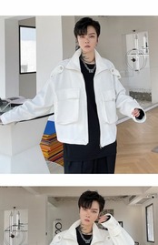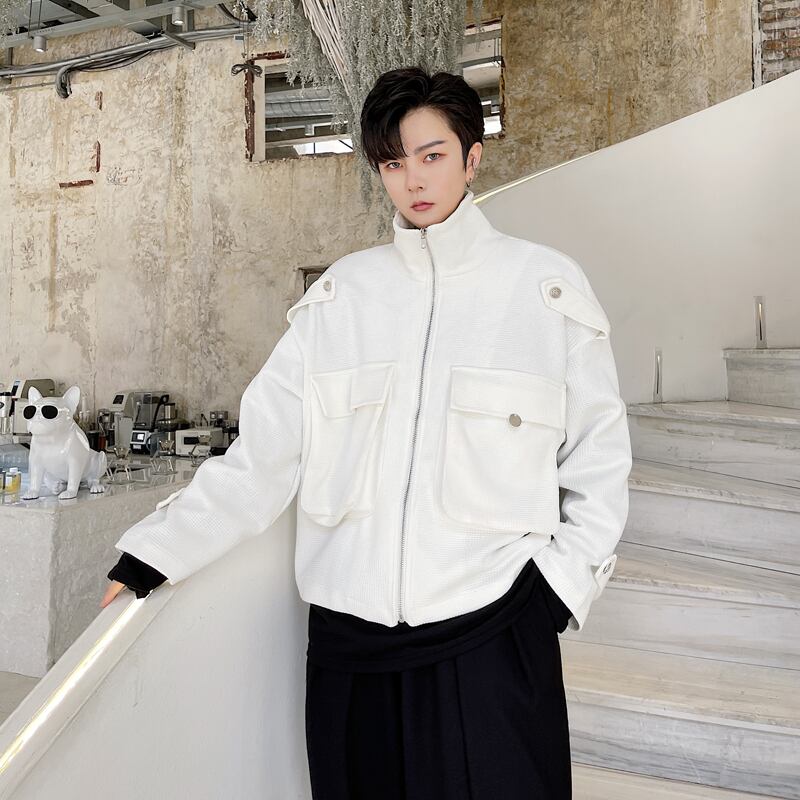 病みカッコイイ メンズファッション ストリートファッション ヒップホップ 個性的 裏原 オータムホワイトジャケット ショートカラー 秋物 ポケット多め マルチポケット ✝ おしゃれ メンズ 19691061404