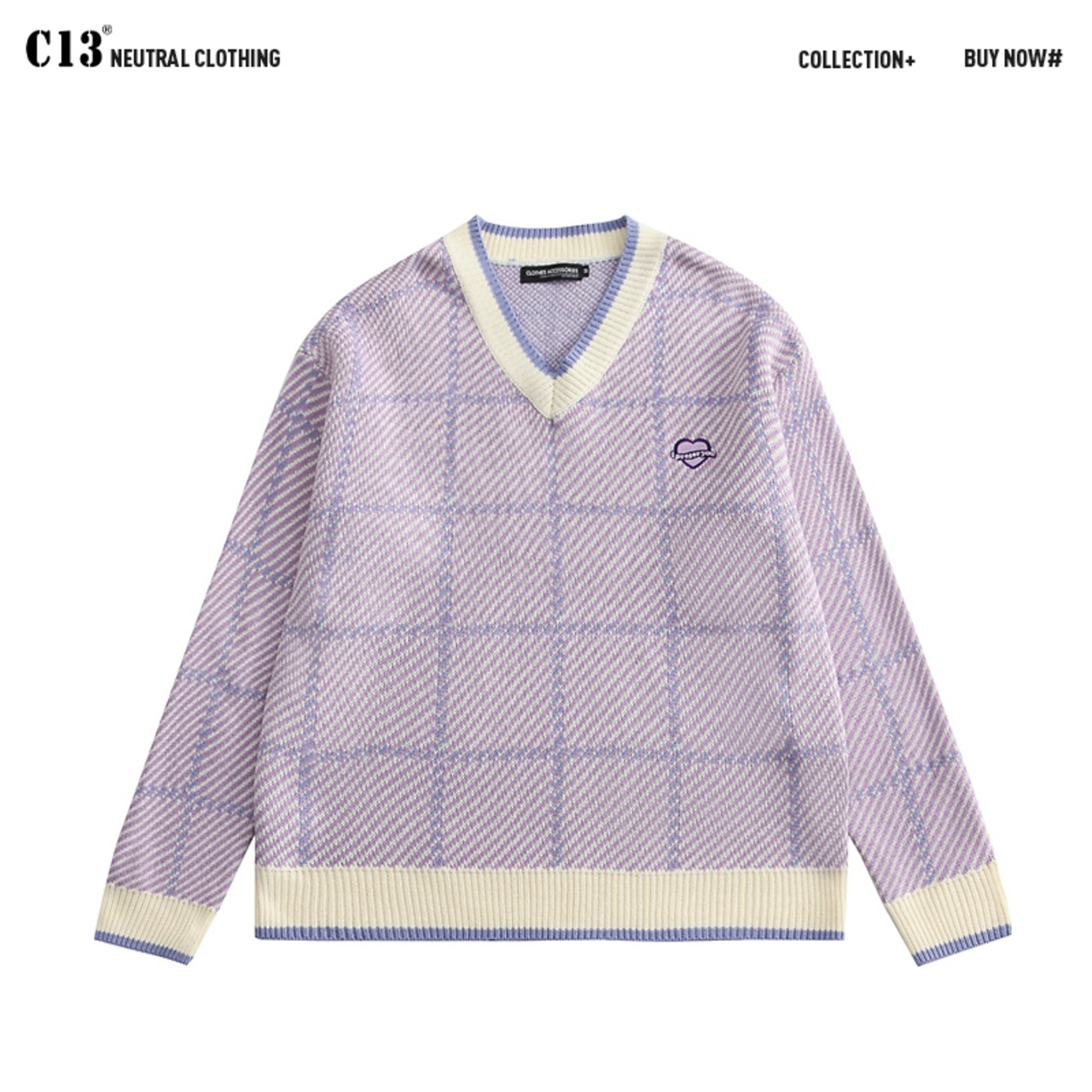 病みカッコイイ メンズファッション ストリートファッション ヒップホップ 個性的 裏原 スタンダード格子柄Vネックセーター レディースルーズカジュアルニットトップス レトロ パープル ✝ メンズファッション11967853042