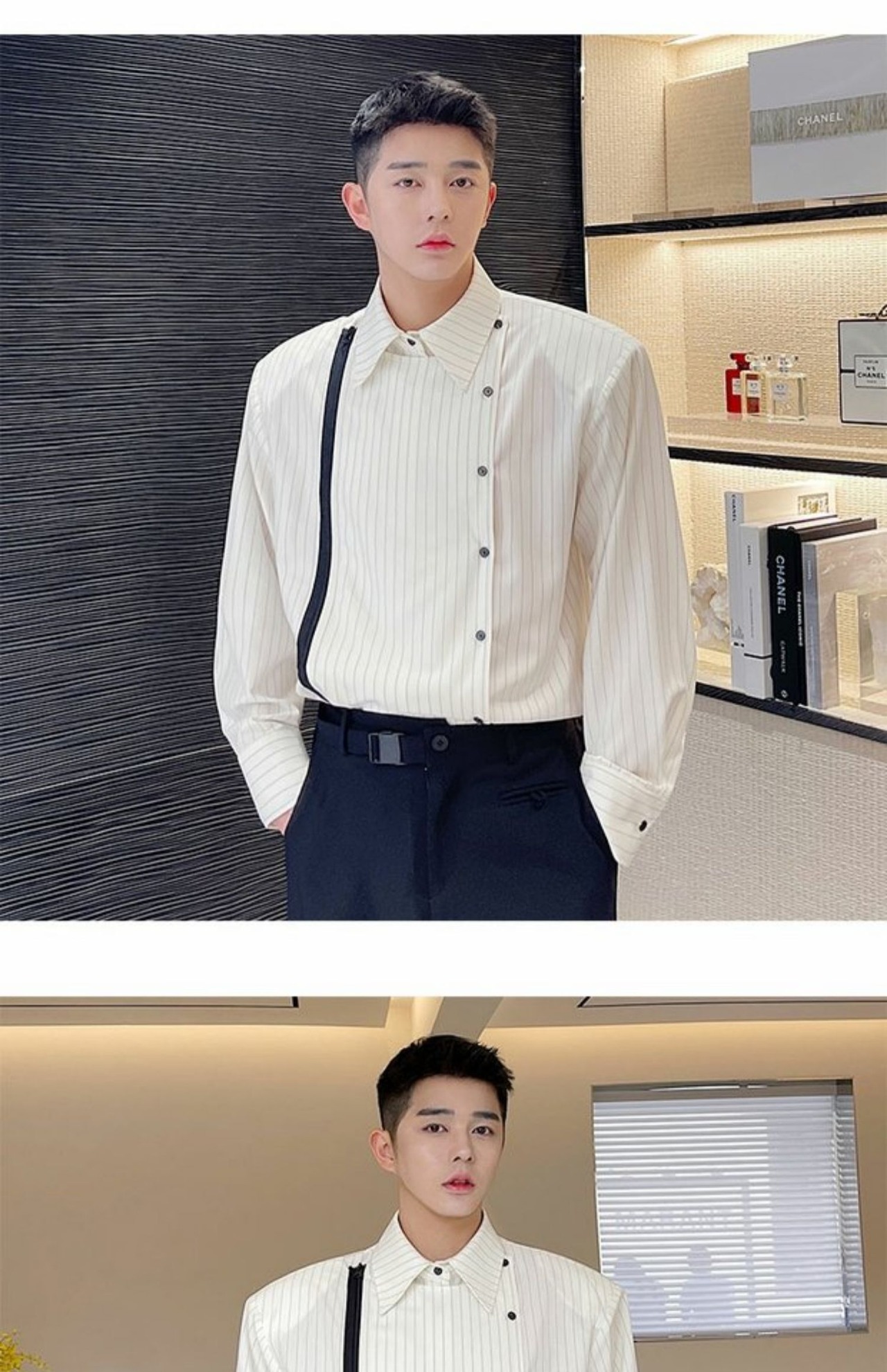 病みカッコイイ メンズファッション ストリートファッション ヒップホップ 個性的 裏原 オータムスタイルストライプジッパーシャツ レッド ロング 秋物 ✝ おしゃれ メンズ 76476653342