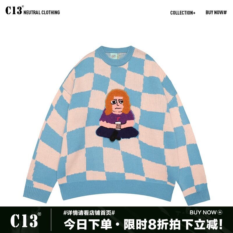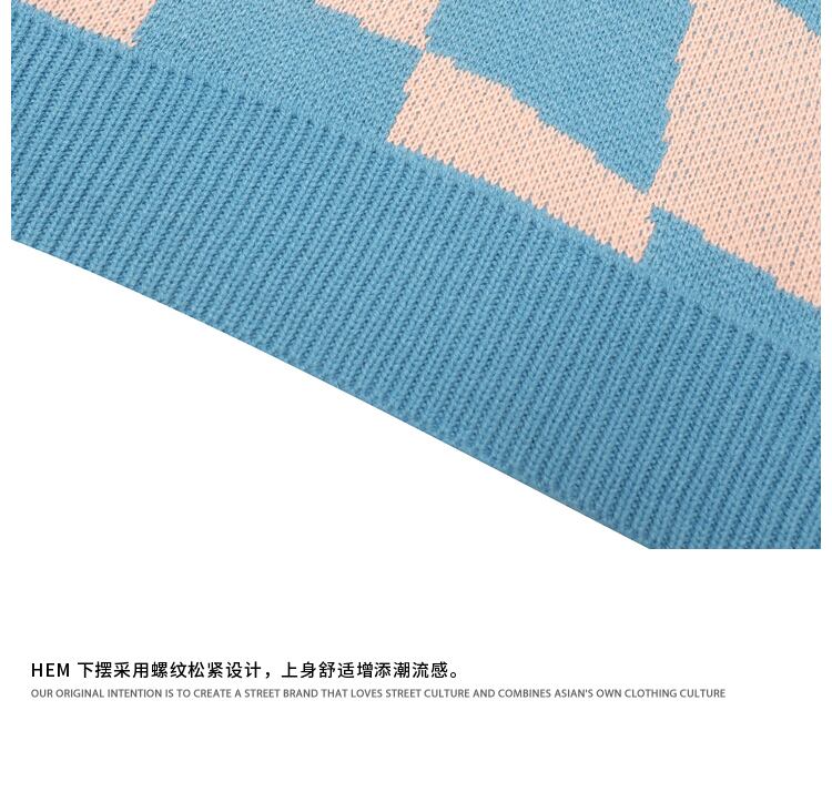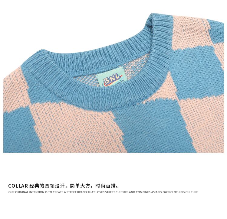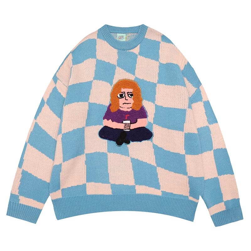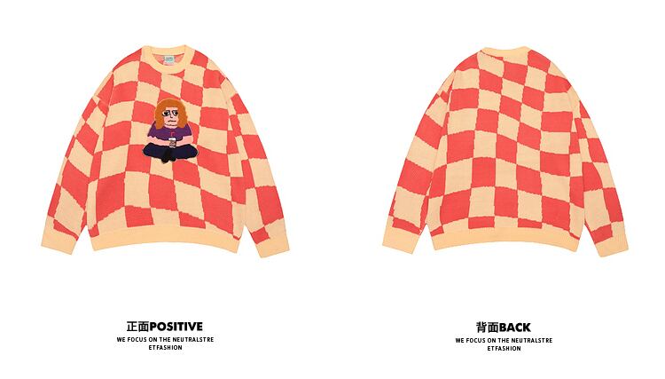 病みカッコイイ メンズファッション ストリートファッション ヒップホップ 個性的 裏原 スタンダード格子柄刺繍ラウンドネックセーター レディースルーズカジュアルニット レトロ Oネック ✝ メンズファッション8038577698