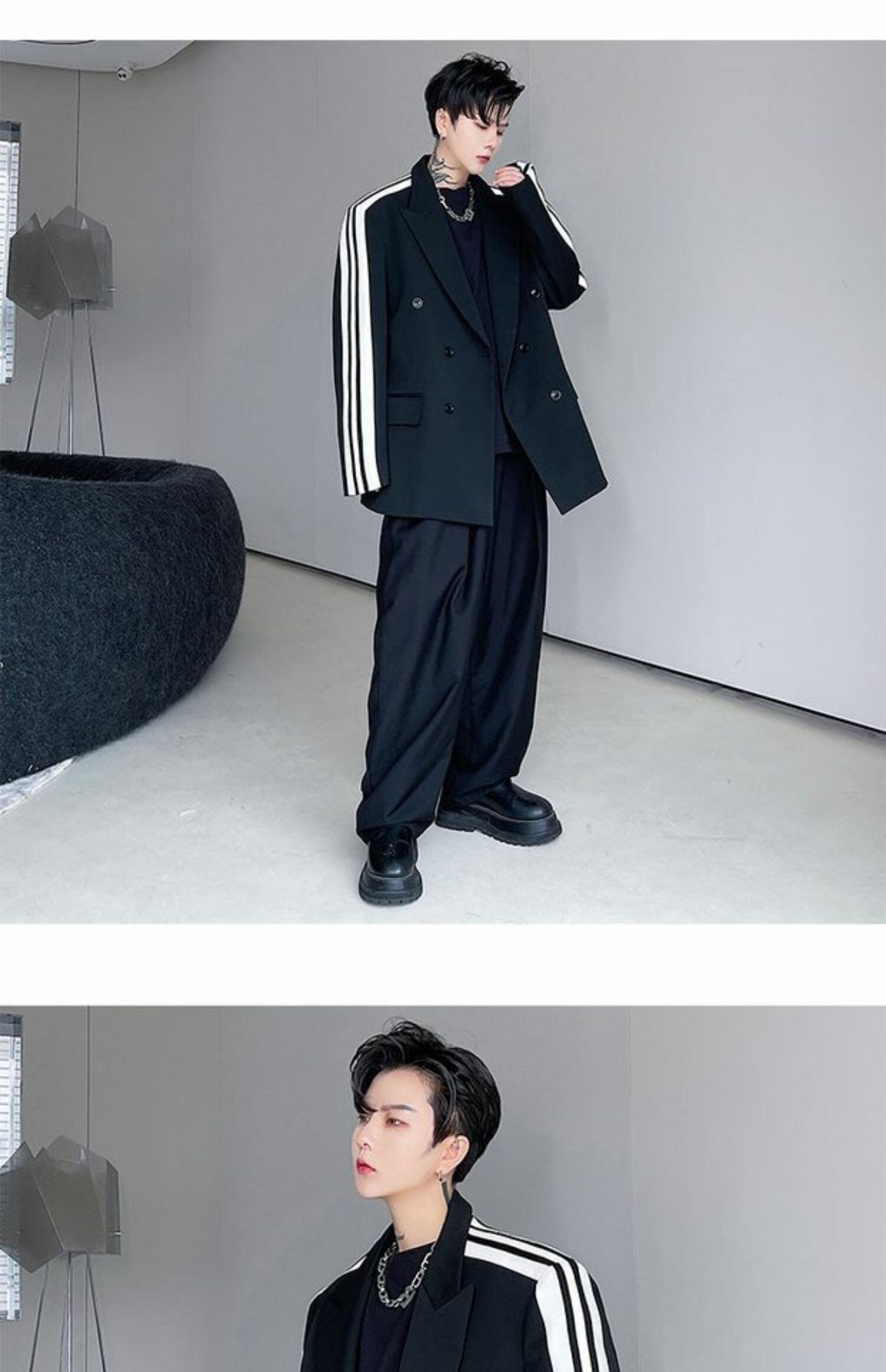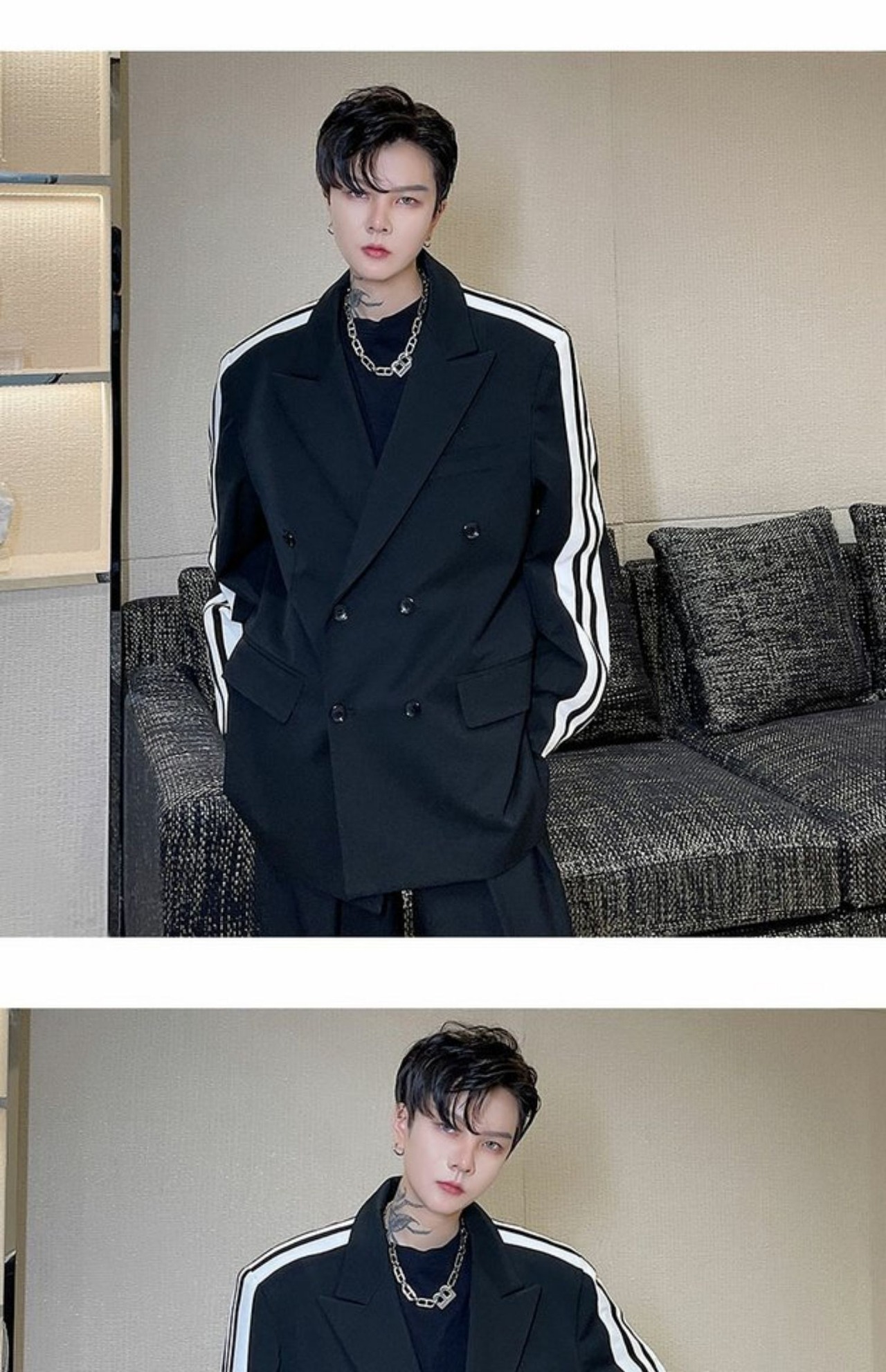 病みカッコイイ メンズファッション ストリートファッション ヒップホップ 個性的 裏原 オータムスタイルストライプジャケット ルーズダブルブレスト ストリート 秋物 ✝ おしゃれ メンズ 29924316031