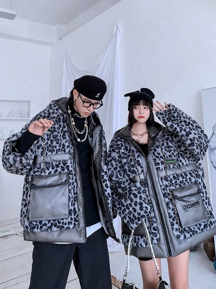 病みかっこいい 豹柄モコモコアウター ファーパーカー カップル ユニセックス メンズ
