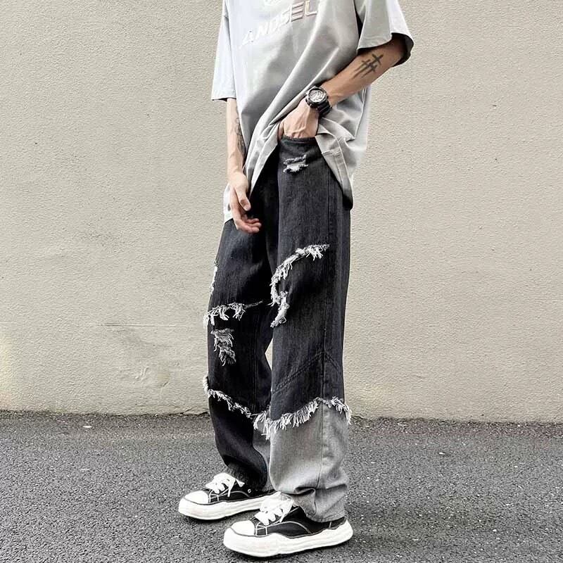 ダメージフリンジユーズド風 ヴィンテージ風デニムパンツ ブラックデニム メンズ ファッション S〜3XL サイズ 大きいサイズ yki23041201